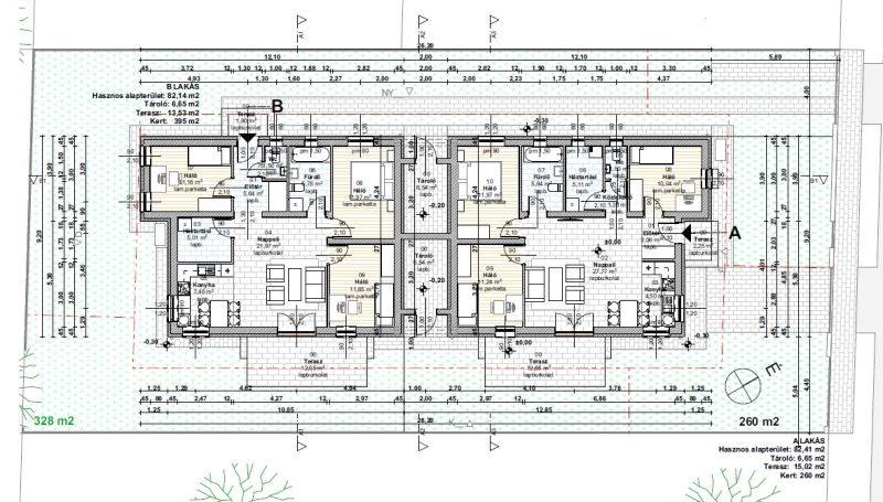 B lakás NETTÓ: 82,14 m2 Tároló: 6,65 m2 Terasz: 13,53 m2 Kert: 395 m2