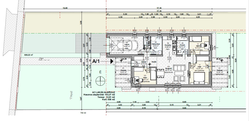 Az ingatlan Hasznos alapterület: 103,27 m2 Terasz: 25,62 m2 Kert: 608 m2